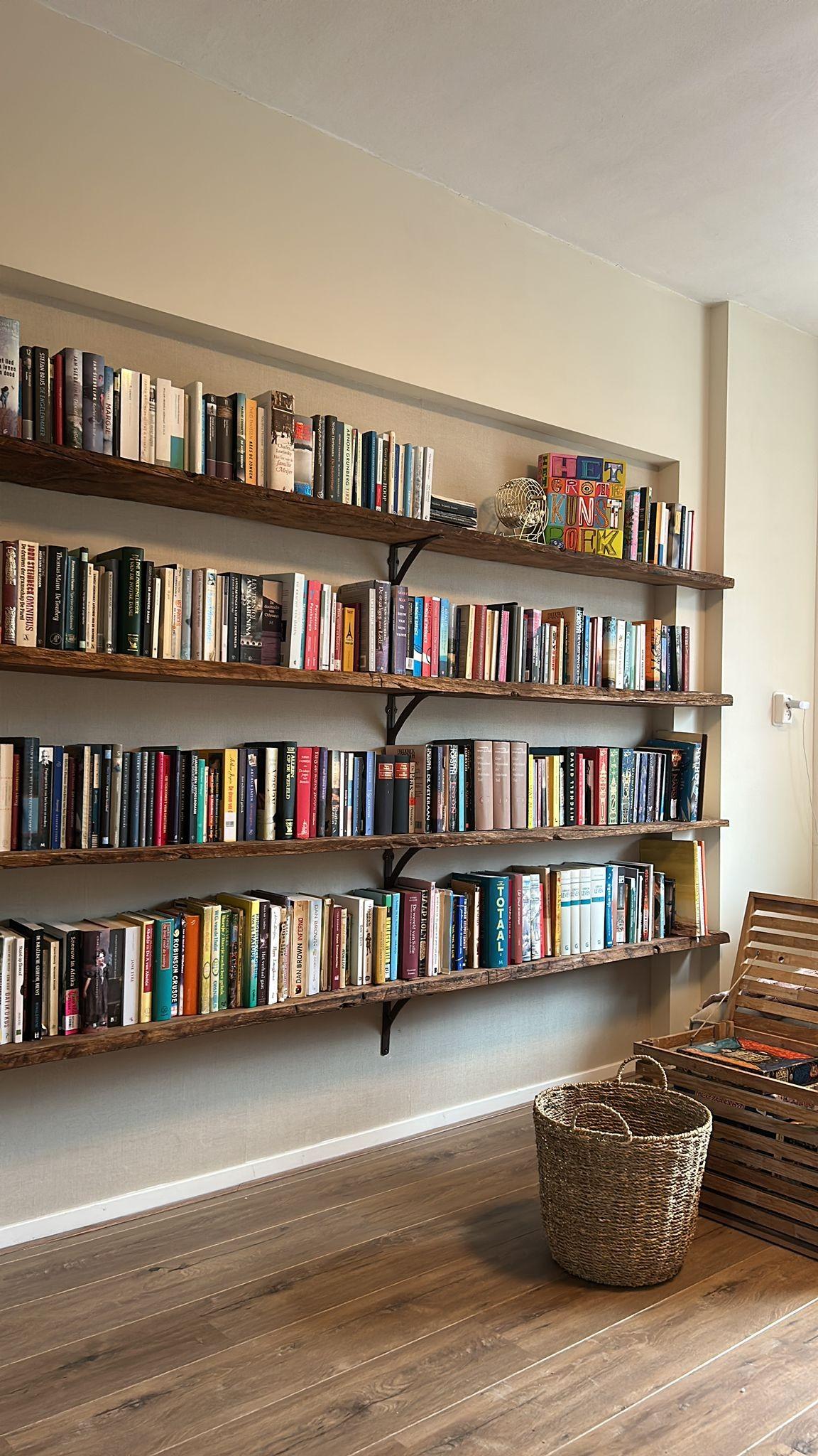 Geleefde boekenkastplanken maken een sfeervolle wand