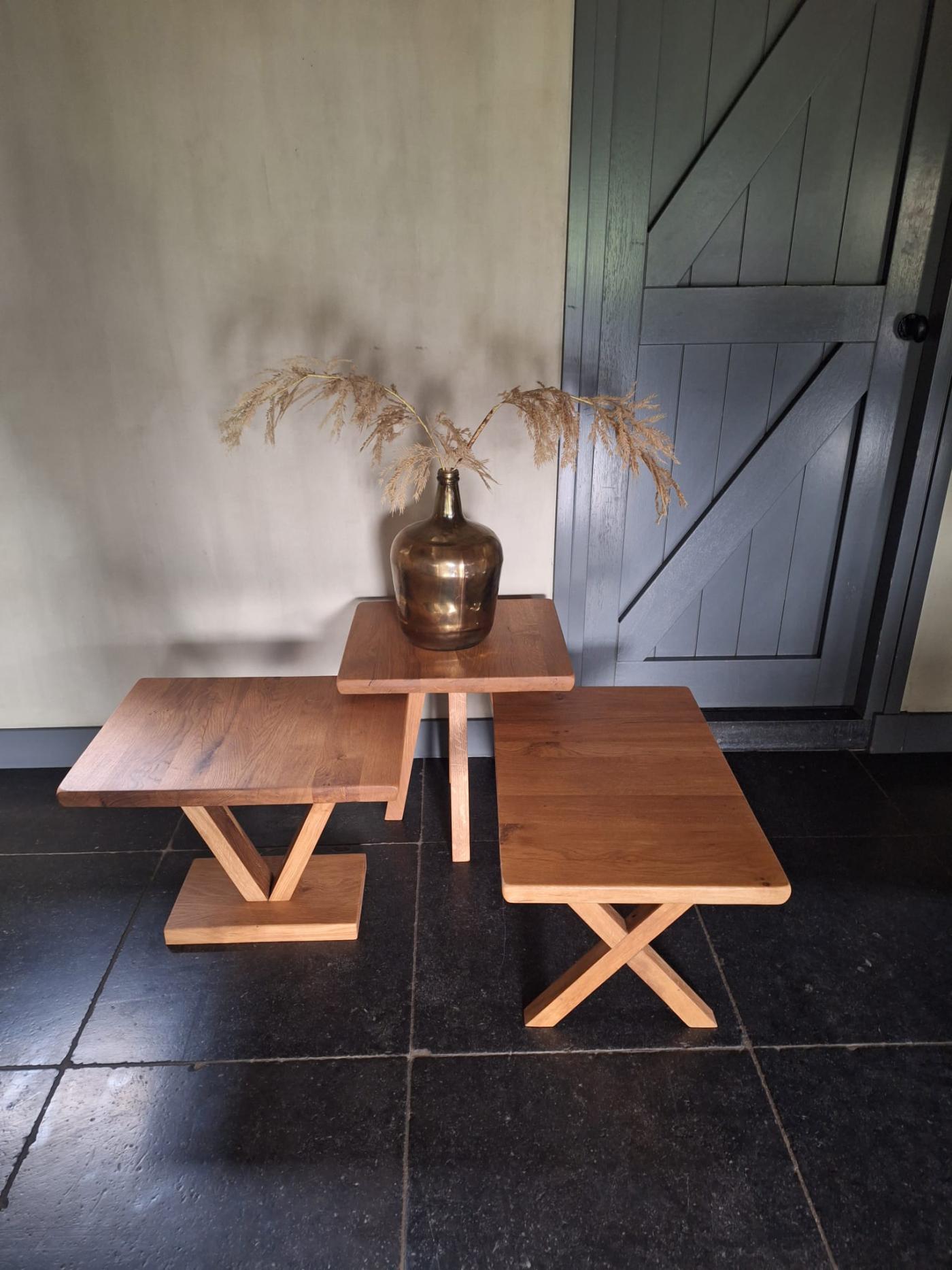 Deze set van drie massief eiken salontafeltjes is méér dan een meubelstuk. Elk tafeltje is onderdeel van een verhaal dat begon met twee grote, oude salontafels. Meubels die voor de klant een emotionele waarde hadden. In plaats van afscheid te nemen van dit hout, besloten we het een nieuw leven te geven in de vorm van een set moderne, elegante tafeltjes.