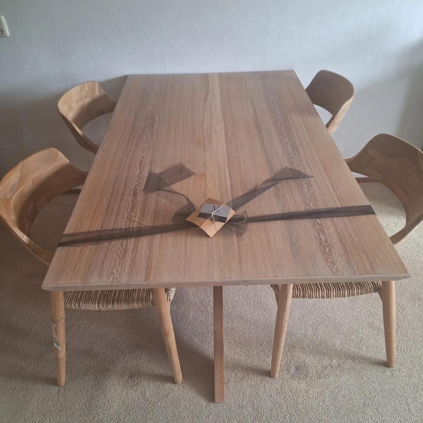 De set is compleet gemaakt met vier bijpassende stoelen in teakhout, uitgevoerd in een naturel afwerking met gevlochten zitting. Samen vormen tafel en stoelen een harmonieuze, warme eethoek met karakter.