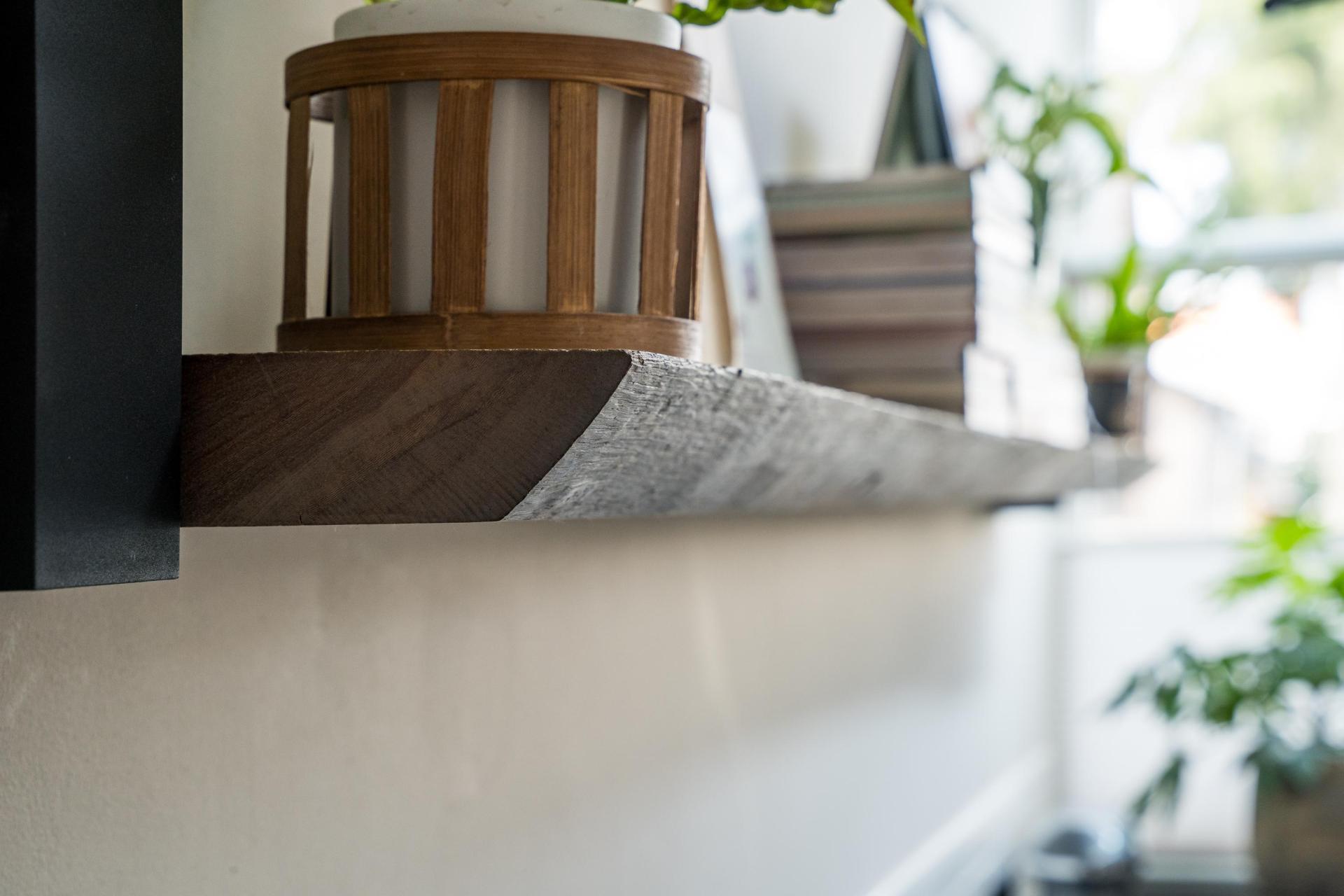 De wandplank is vervaardigd uit massief Azobé hout, een extreem harde en sterke houtsoort afkomstig van een oude scheepswerf. Dankzij de behandeling met Odie’s Oil is de plank goed beschermd, waterafstotend en makkelijk schoon te houden.