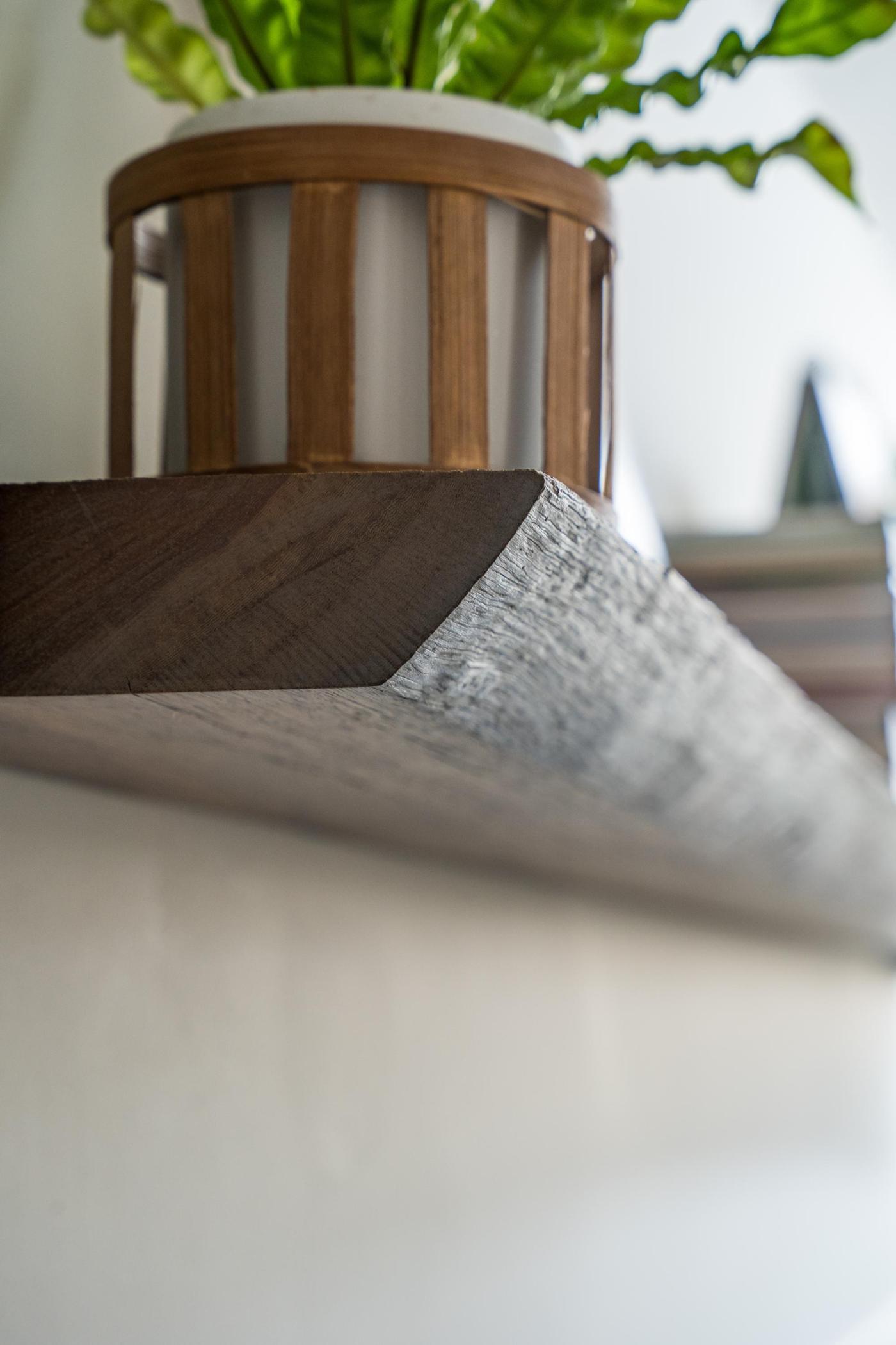 Wat deze plank extra bijzonder maakt, is dat de barstrand behouden is. Hierdoor blijft het karakter van het hout zichtbaar én voelbaar. De natuurlijke vorm en structuur geven extra diepte aan het geheel.