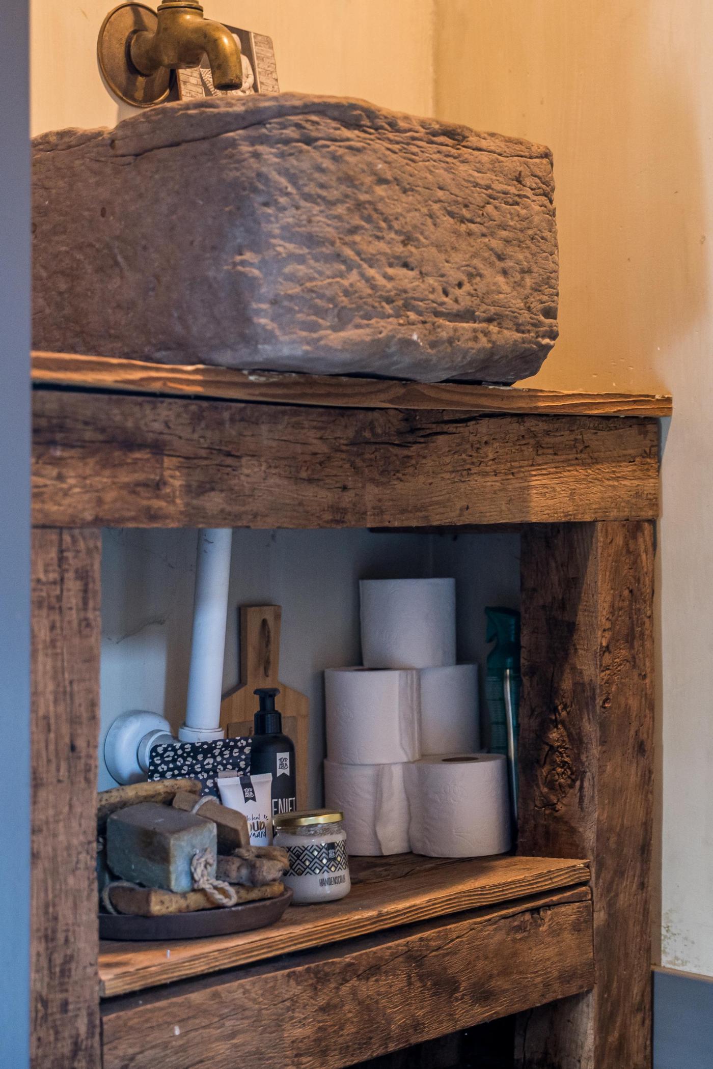 Dit wasmeubel is volledig gemaakt van oud eiken balken die ook elders in dit interieur zijn toegepast. Denk bijvoorbeeld aan de omlijsting van het fornuis, de keukenfronten of dragende elementen in de ruimte. Zo ontstaat één geheel in sfeer en materiaal.